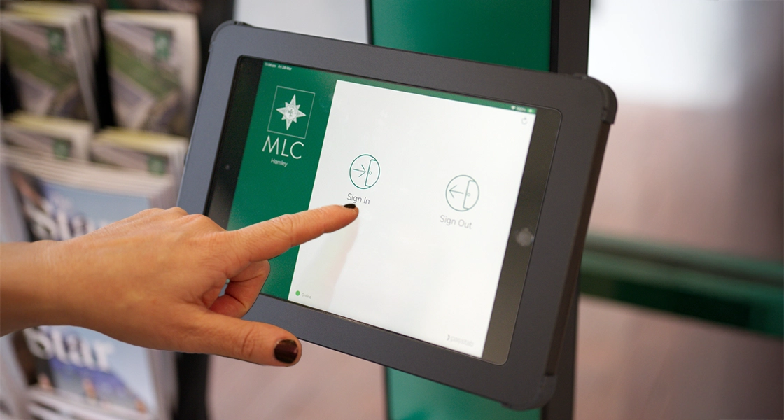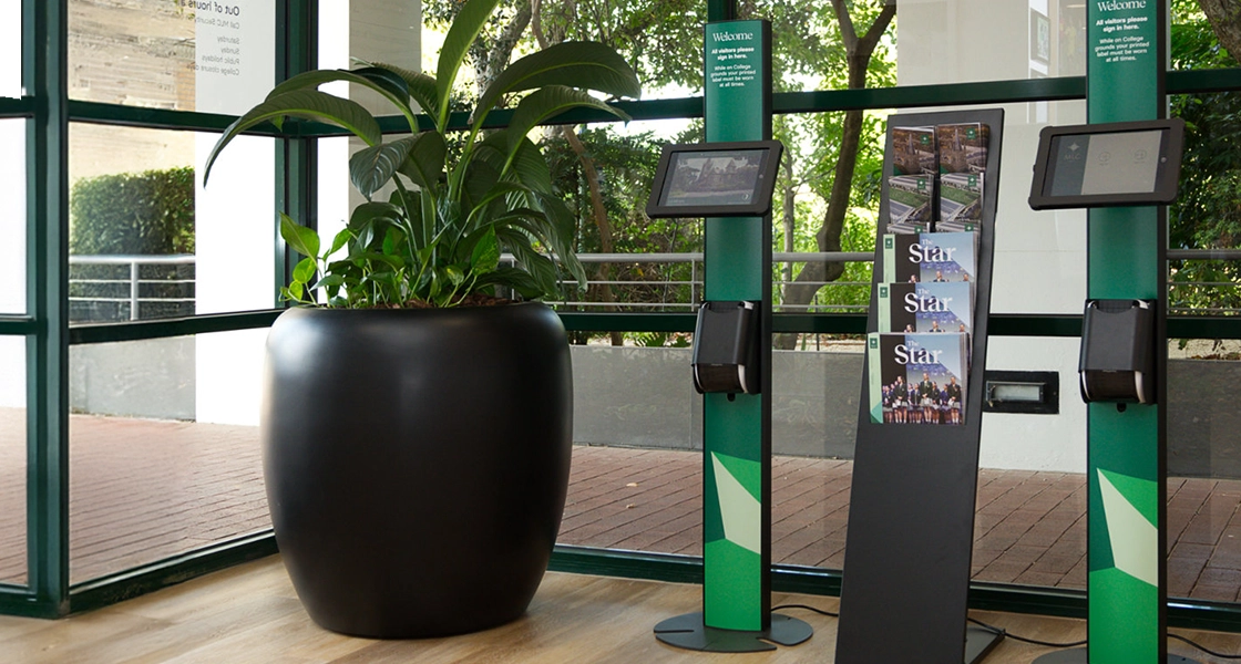 Dual visitor management kiosks at MLC’s Kew campus reception. Originally deployed with generic signage to manage visitor flows from the start of the school term, stands were later reskinned with MLC branding.